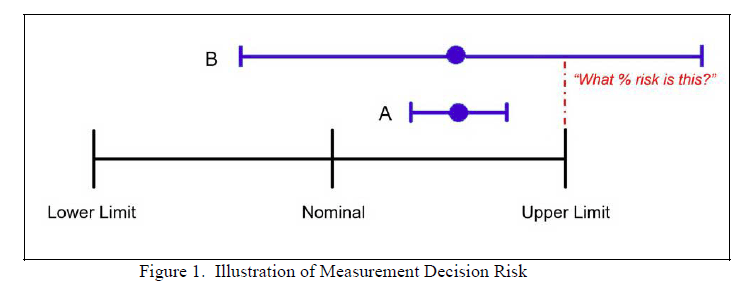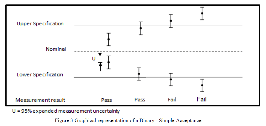 La figura 1 del “Draft Ver.JW4 ILAC-G8:20XX” ilustra gráficamente la importancia de tener presente la incertidumbre de la medición o ensayo. La figura 1 muestra dos mediciones idénticas, pero con diferentes incertidumbres de medición. La incertidumbre expandida en el resultado inferior (caso A) se encuentra completamente dentro del límite de tolerancia. La parte superior, el resultado (caso B) tiene una incertidumbre de medición significativamente mayor. El riesgo de falsamente aceptar un resultado en el caso B es mayor debido a la mayor incertidumbre de medición. (por ejemplo, ver “What % risk is this?” en la figura 1).