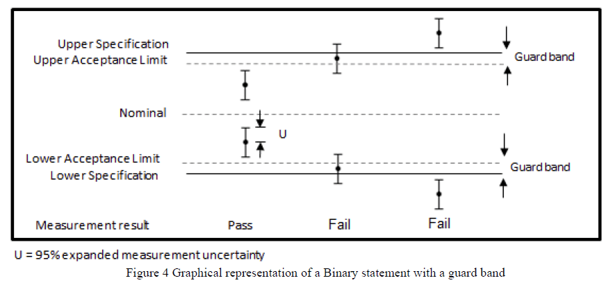 A menudo, la banda de protección “w = r.U” se basa en un múltiplo “r” de la incertidumbre expandida de la medición “U”. Para una regla de decisión binaria, un valor medido por debajo del límite de aceptación “AL = TL – w” es aceptado.