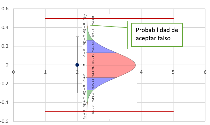 Con lo cual se puede ver que la probabilidad de aceptar un resultado falso es el área encerrada por encima de la tolerancia superior.