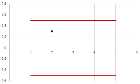 Como la incertidumbre está calculada con el 95% podemos afirmar que la probabilidad de que una aceptación falsa es igual a 2.7% (2.5% de un lado y 0.2% del otro). Todavía este caso es fácil de predecir y bajo la guía ILAC G8 en su versión anterior estaríamos dentro de especificaciones.